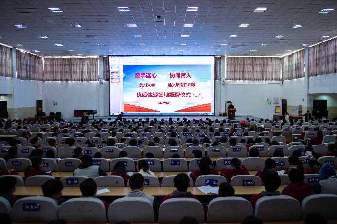 為加強貴州大學與中學的互動交流,增進高校與中學的交流,強化協同育人,建設優質生源基地,202436日,校黨委書記楊未教授率隊到貴州省示范性高中遵義市南白中學開展“牽手連心,協作育人”優質生源基地授牌儀式。貴州大學兩辦、招就處、3522集團新網站相關負責人,遵義市南白中學領導班子、500余名高三畢業班同學參加活動。